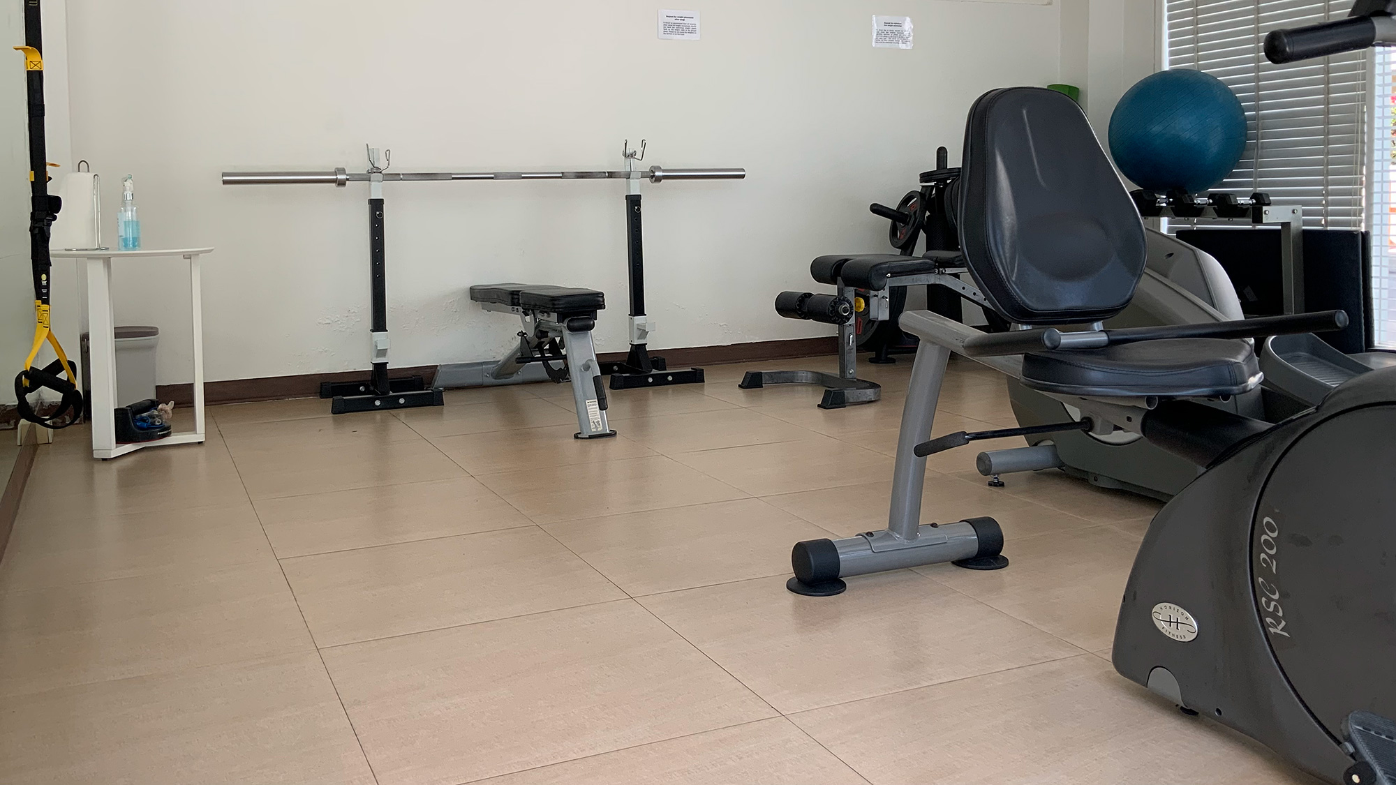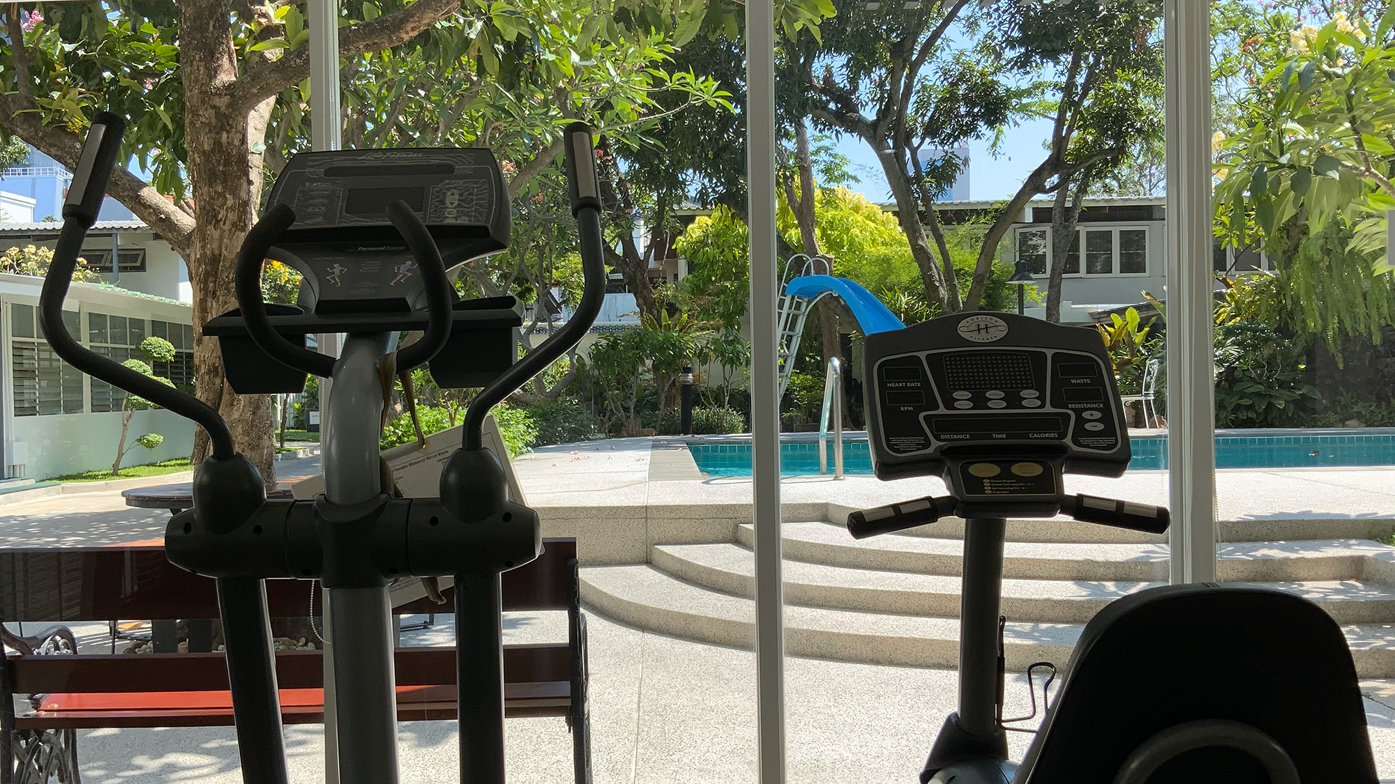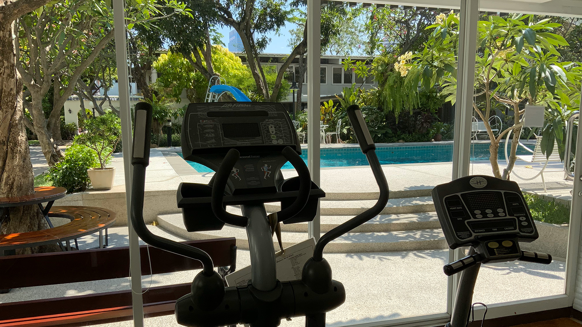 - 庭園を望むエクササイズルームは24時間利用可能